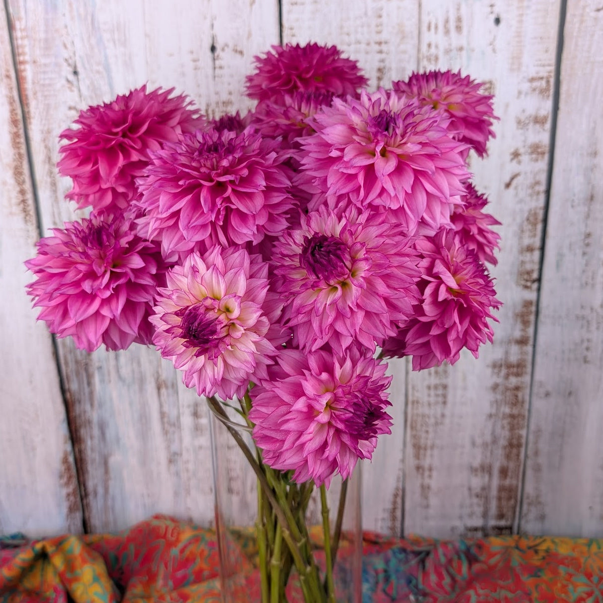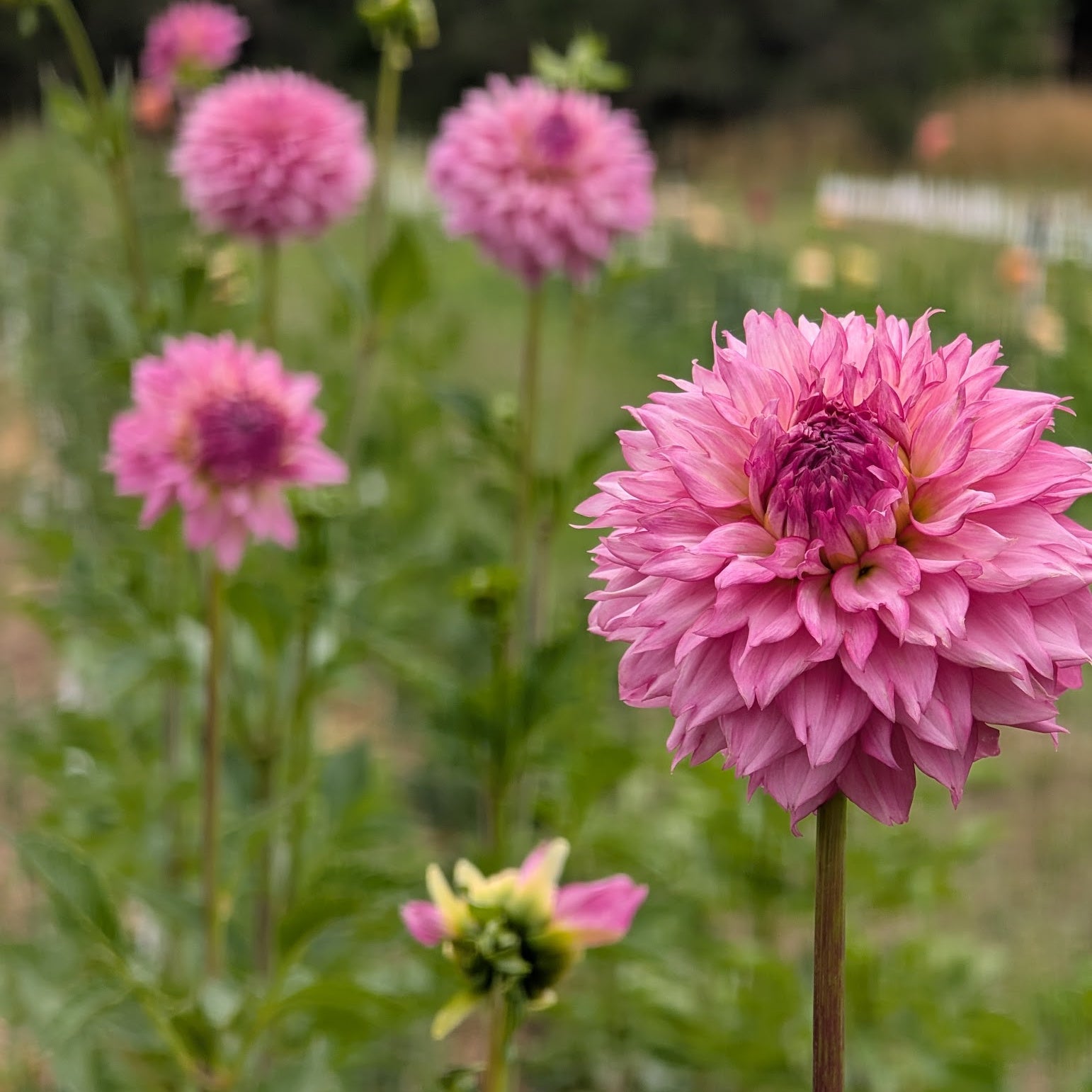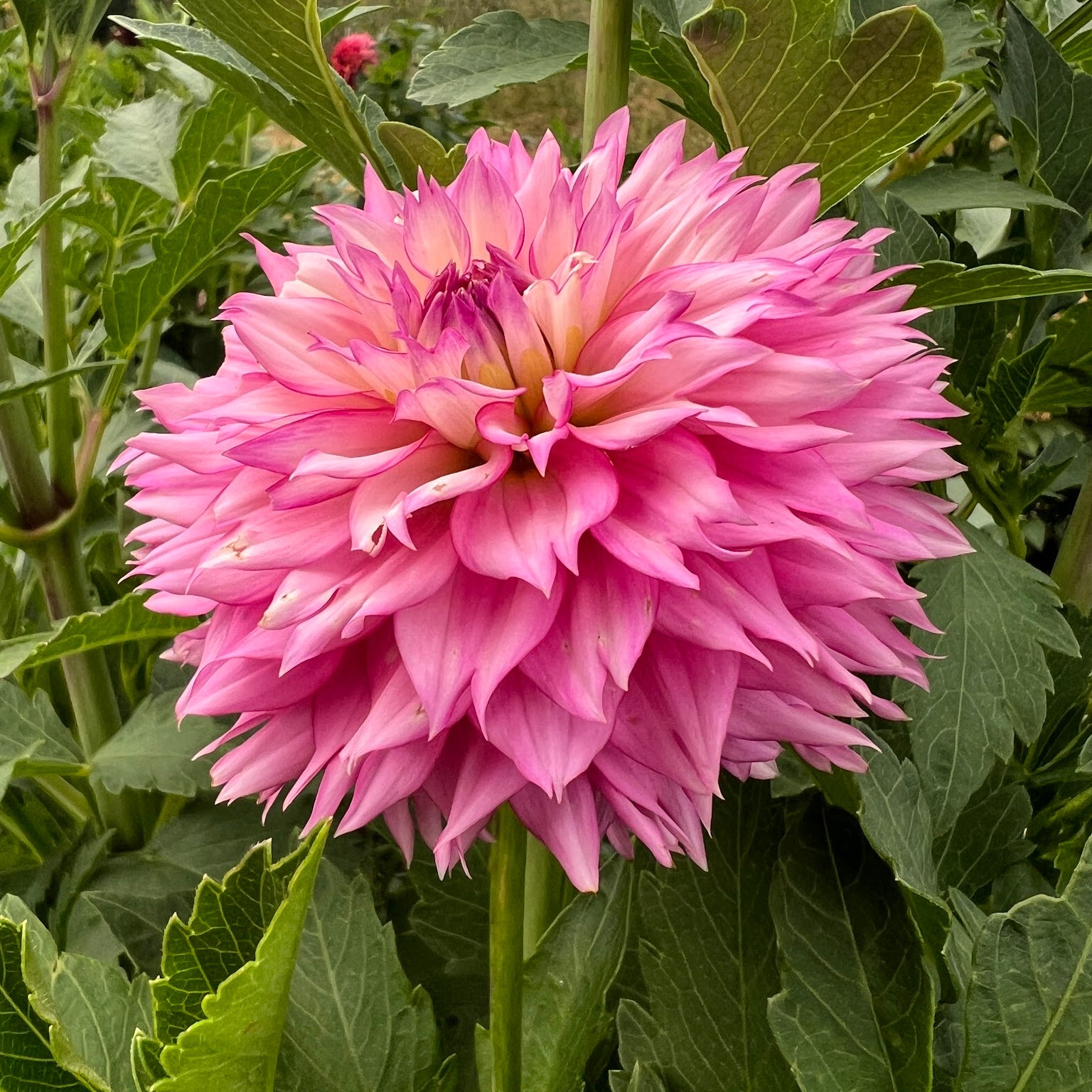 Approximately 4" blooms, pink and white petals with pink edging, solid bloom attachment on long strong stems. Blooms prolifically all season long, makes seed and nice tubers.